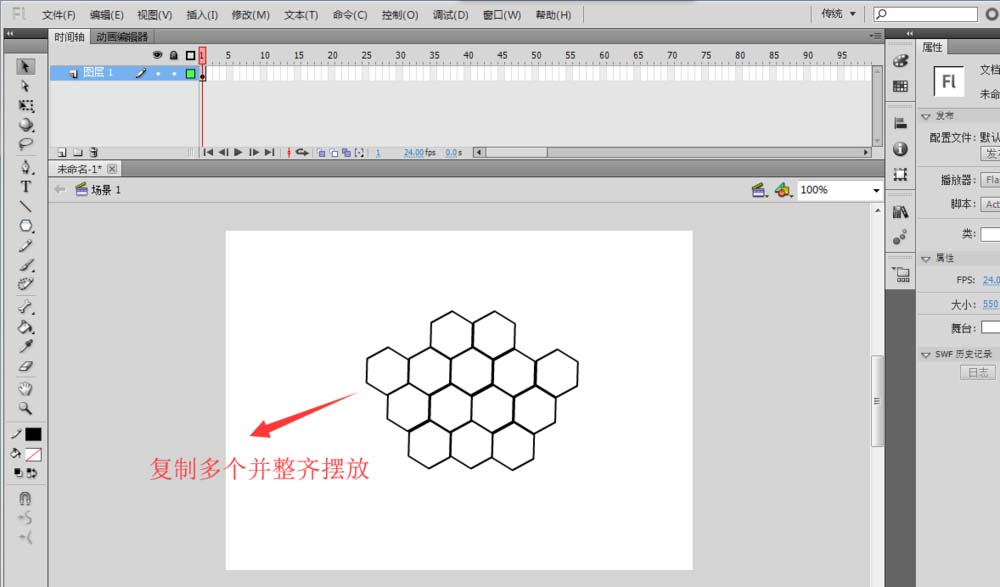 4、繼續(xù)進(jìn)行復(fù)制與粘貼操作,得到多個(gè)正六邊形,并在舞臺(tái)上將這些正六邊形整齊排列。