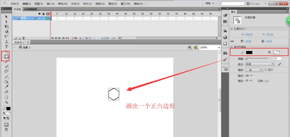 2、拖動(dòng)鼠標(biāo)在舞臺(tái)區(qū)域繪制一個(gè)正六邊形出來(lái),并在屬性窗口中設(shè)置填充顏色為無(wú)填充,筆觸顏色為大小為2的黑色。