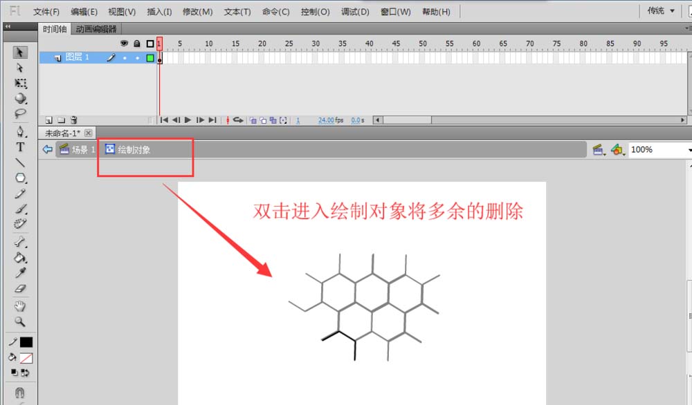 5、雙擊在外面的正六邊形進(jìn)入對(duì)象繪制,選中多余的線條,按delete將其刪除。得到如下圖的效果。