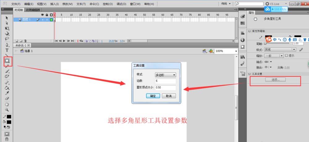 1、在flash中找到并選擇多角星形工具,單擊選項(xiàng)設(shè)置邊數(shù)為6,樣式為多邊形。