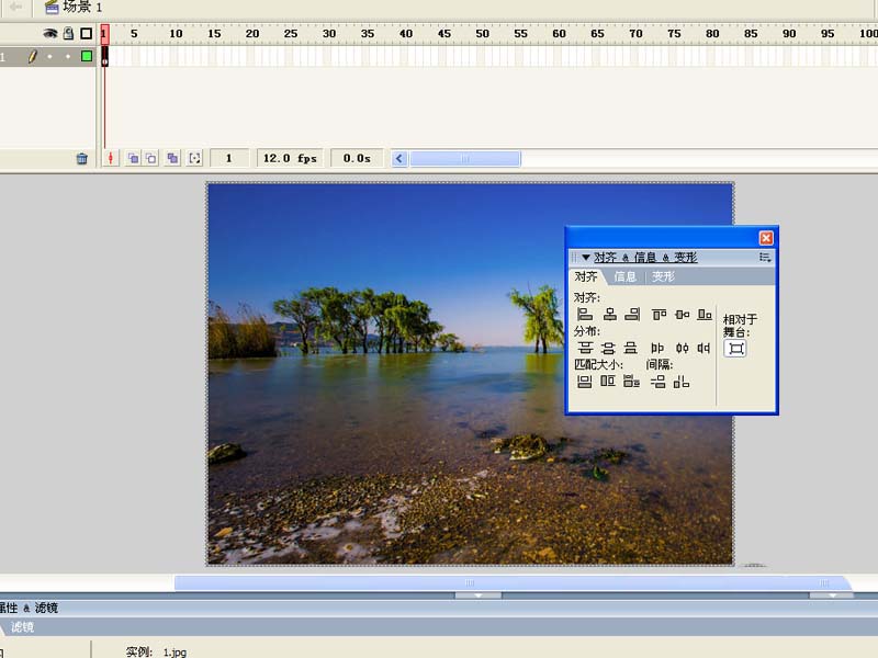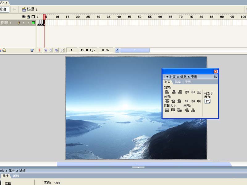 3、接著從庫(kù)中拖拽一張圖片到舞臺(tái),并設(shè)置水平居中和垂直居中。