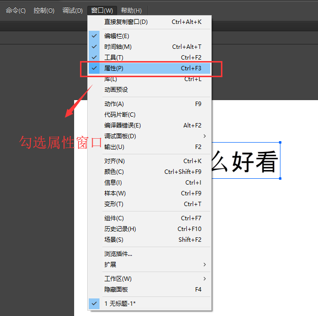 3、點開菜單欄中的窗口菜單,在窗口菜單欄中找到“屬性”,將屬性前面的勾選進行選中,這樣就會打開屬性窗口了。