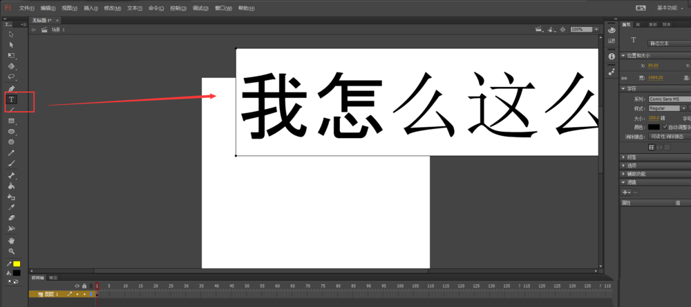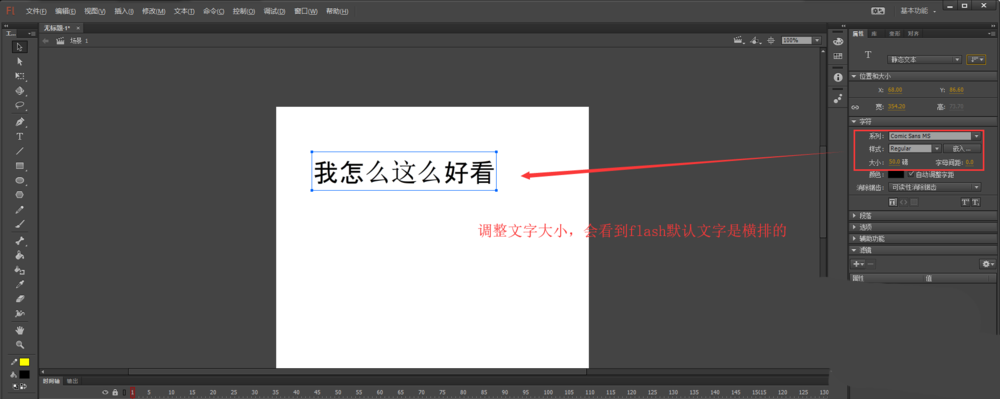 4、選中橫排文字,因為flash記住了上一次我們設(shè)置的文字屬性,很明顯,輸入的文字太大,在文字屬性窗口中更改文字大小數(shù)值,將文字該小并移到合適位置。