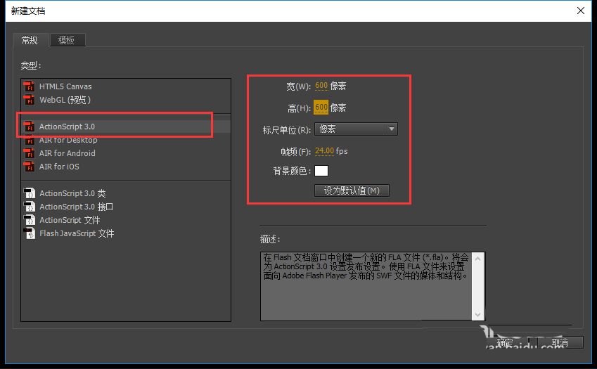 1、打開啟動flash動畫制作軟件,在文件中執(zhí)行新建命令,新建一個flash文檔,設(shè)置文檔的屬性,比如說大小與背景顏色等。