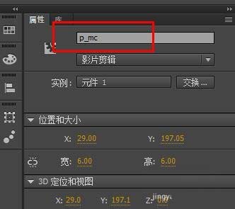 2、新建一個影片剪輯,里面放一個紅色的小圓形,位置如圖。實例名設置為p_mc