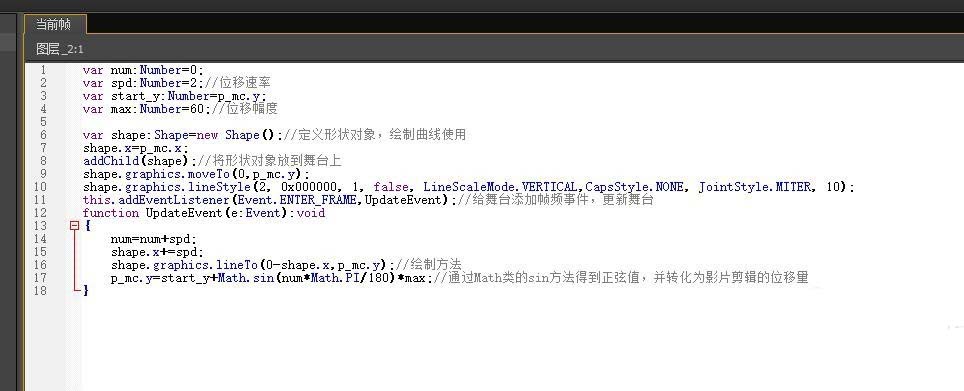var num:Number=0;var spd:Number=2;//位移速率var start_y:Number=p_mc.y;var max:Number=60;//位移幅度var shape:Shape=new Shape();//定義形狀對象,繪制曲線使用shape.x=p_mc.x;addChild(shape);//將形狀對象放到舞臺上shape.graphics.moveTo(0,p_mc.y);shape.graphics.lineStyle(2, 0x000000, 1, false, LineScaleMode.VERTICAL,CapsStyle.NONE, JointStyle.MITER, 10);this.addEventListener(Event.ENTER_FRAME,UpdateEvent);//給舞臺添加幀頻事件,更新舞臺function UpdateEvent(e:Event):void{num=num+spd;shape.x+=spd;shape.graphics.lineTo(0-shape.x,p_mc.y);//繪制方法p_mc.y=start_y+Math.sin(num*Math.PI/180)*max;//通過Math類的sin方法得到正弦值,并轉化為影片剪輯的位移量}