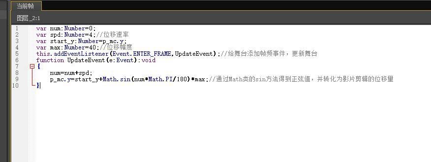 var num:Number=0;var spd:Number=4;//位移速率var start_y:Number=p_mc.y;var max:Number=40;//位移幅度this.addEventListener(Event.ENTER_FRAME,UpdateEvent);//給舞臺添加幀頻事件,更新舞臺function UpdateEvent(e:Event):void{num=num+spd;p_mc.y=start_y+Math.sin(num*Math.PI/180)*max;//通過Math類的sin方法得到正弦值,并轉化為影片剪輯的位移量}