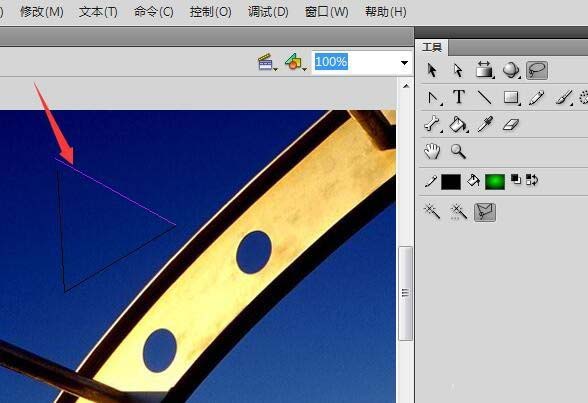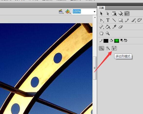 6、第三個是多邊形模式,使用該按鈕可以選擇多邊形區(qū)域,如圖,先在圖像上點擊一下松手,鼠標移動就會拉出一條直線,再點擊一下,直線就固定了,繼續(xù)到另一處點擊,最后回到開頭處雙擊一下,就會出現(xiàn)一個多邊形選中的區(qū)域。
