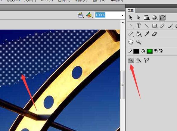 5、設(shè)置好后,點擊第一個魔術(shù)棒按鈕,對著圖像上某個地區(qū)點擊,就會選中閾值范圍里的顏色像素,如圖所示。