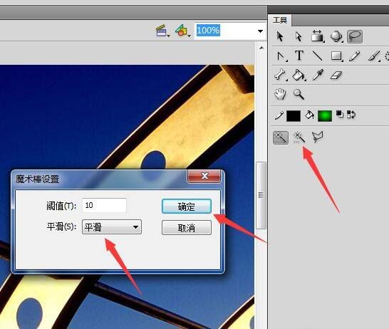 4、當選中套索工具后,在工具欄下方會有三個對應(yīng)的附加按鈕。第一個是魔術(shù)棒,第二個是魔術(shù)棒設(shè)置。點擊魔術(shù)棒設(shè)置按鈕,在對話框中可以設(shè)置閾值大小及平滑程度。