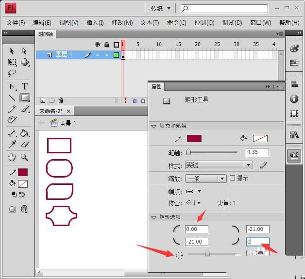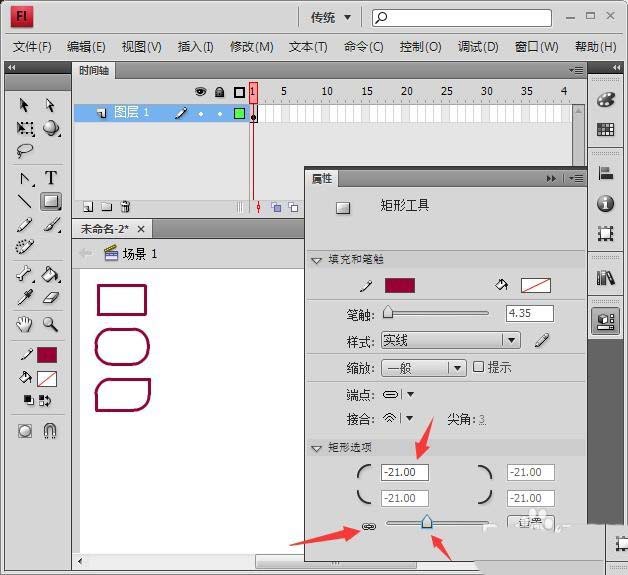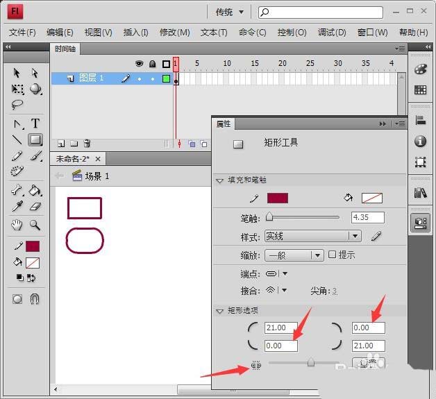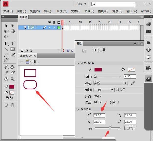 3、在屬性面板的矩形選項下方將四個文本框中輸入21,或拉動下方的滑塊,如圖所示,然后再拉出矩形,我們看到這是一個圓角矩形,四個文本框即四個角的圓度。