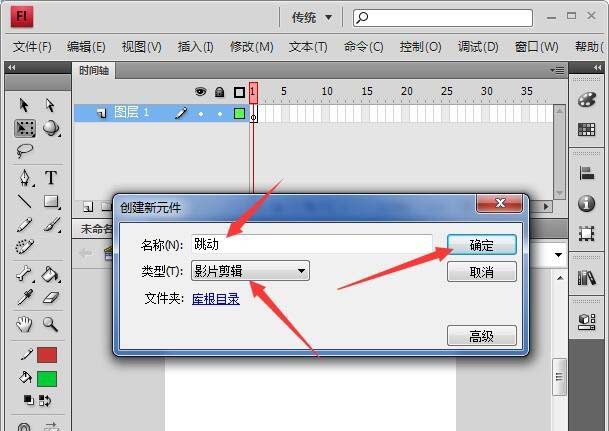 2、在彈出的創建新元件對話框中設置名稱為“跳動“或其他名字,再選擇類型為影片剪輯,再按確定。