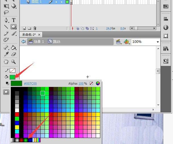 4、繼續點擊填充顏色,選擇需要的皮球顏色。然后在影片工作區中按住Shift鍵不放拉出一個正圓。