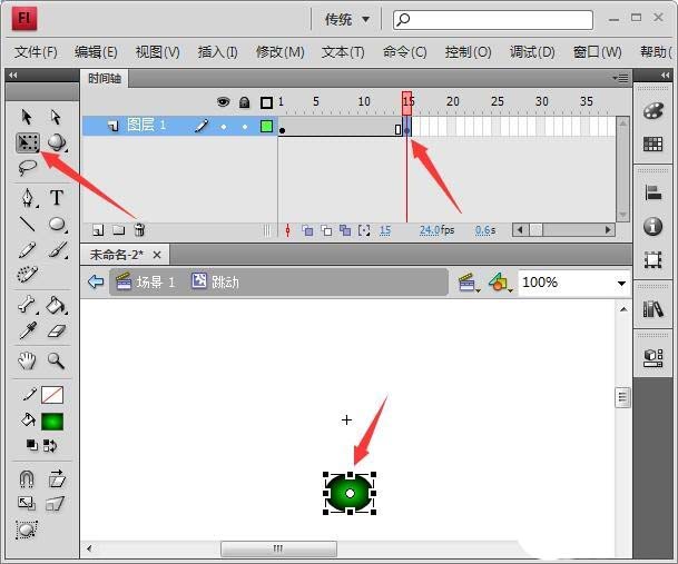 5、畫好圓后,在時間軸的第15幀處按右鍵,點擊插入關鍵幀。點擊第15幀,再點擊選中畫好的皮球,點擊左側的任意變形工具,從皮球頂部控制點按住往下拉扁一點。
