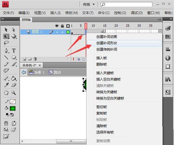 6、點擊第一幀,按住Shift鍵不放把皮球直線向上拉動一段位置。然后在第1到第15幀之間按右鍵,點擊創建補間形狀。