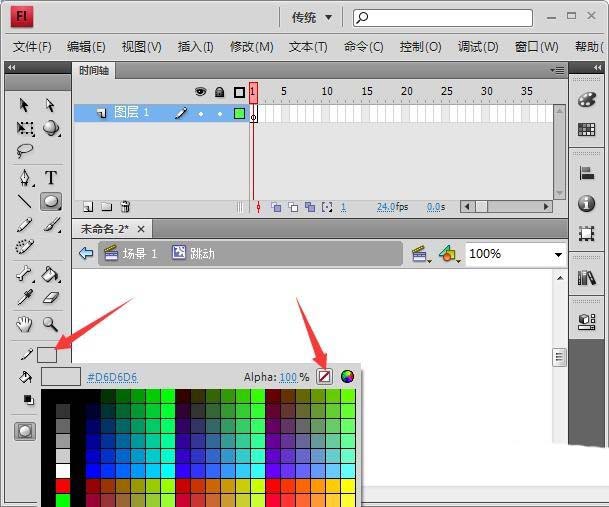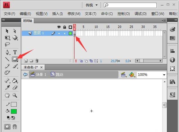 3、接下來點擊在時間軸的第一幀,在左側點擊橢圓工具。再點擊底下的筆觸顏色,選擇關閉顏色。