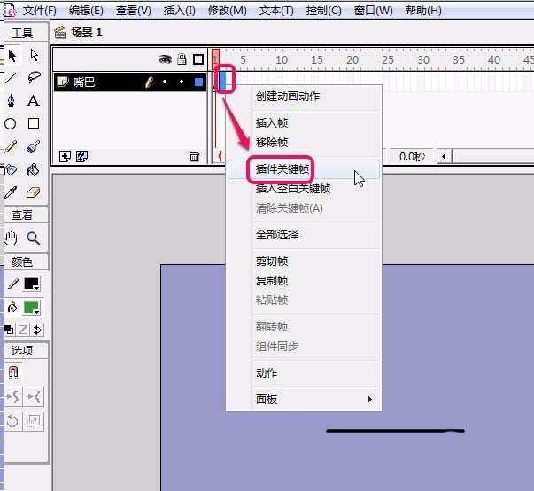 3、在第2幀單擊鼠標右鍵,選擇菜單中的“插入關鍵幀”命令。