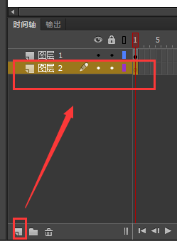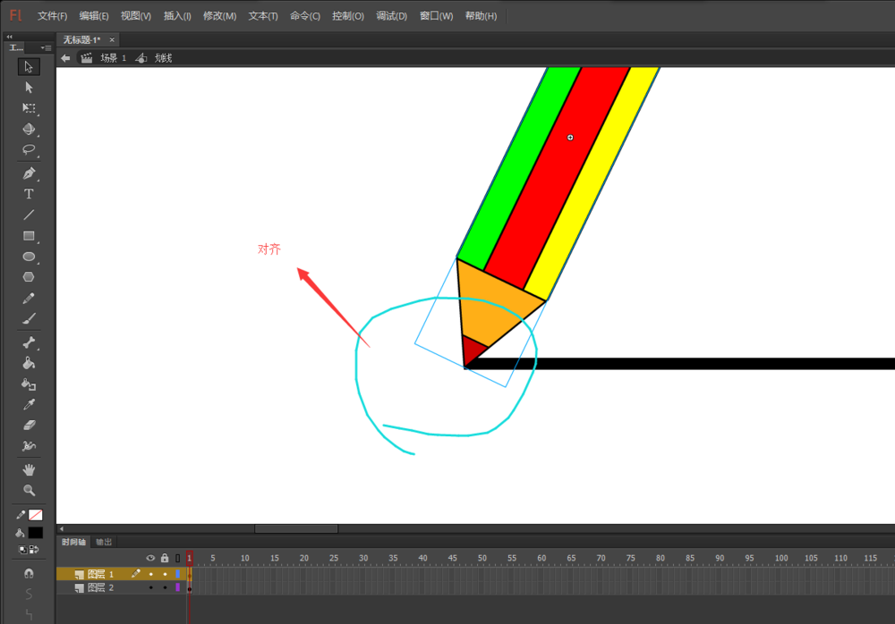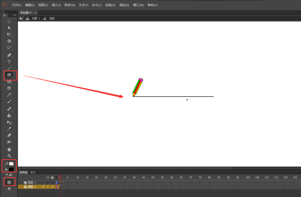 3、在元件的時間軸中新建一個圖層2,把圖層2移到圖層1的下方,選中圖層2,選中矩形工具,設置筆觸顏色為無,填充顏色為黑色,勾選對象繪制按鈕,在畫布中畫出一個線條出來。放大畫布,將鉛筆與線條的左側進行對齊。
