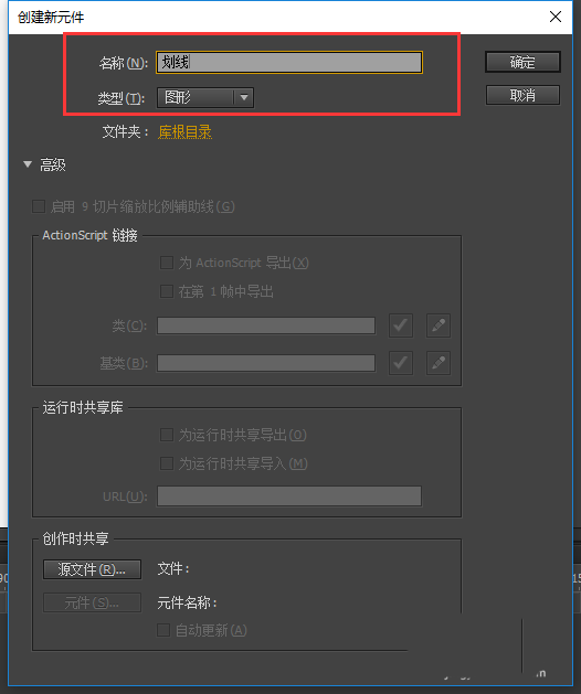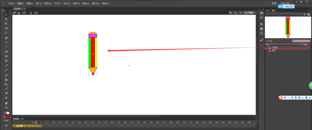 2、選擇插入新建元件,新建一個命名為“劃線”的圖形元件,進入到圖形元件中,將我們現成的小鉛筆元件直接復制粘貼到庫中,并把這個小鉛筆拖入到畫布上,選擇任意變形工具,調整鉛筆的大小與傾斜度。