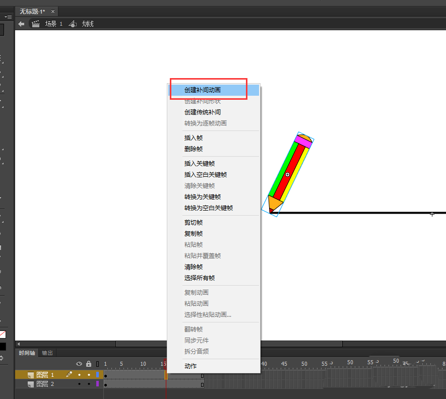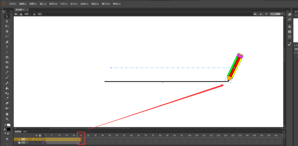 4、選中圖層1與圖層2,在兩個圖層的第25幀位置都按F5插入一個幀,然后在圖層1第1幀到第25幀之間創建補間動畫;選中圖層1的第25幀,按住shift鍵水平移動小鉛筆,將鉛筆移動到線條的右側。