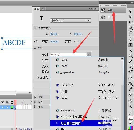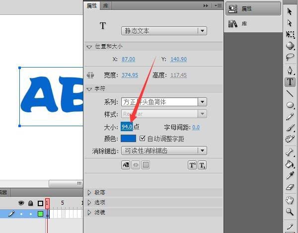 1、首先,打開Flash軟件,新建文檔,點擊右側的文字工具,在界面上打出需要的文字。如圖。