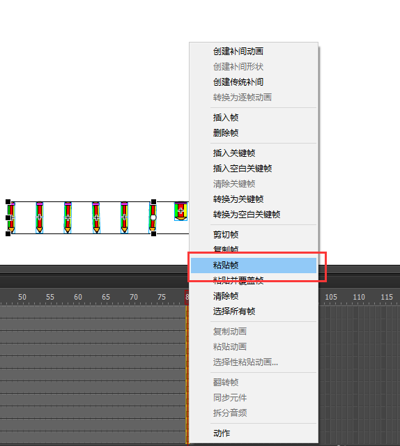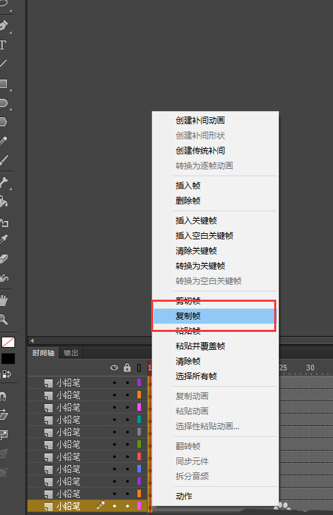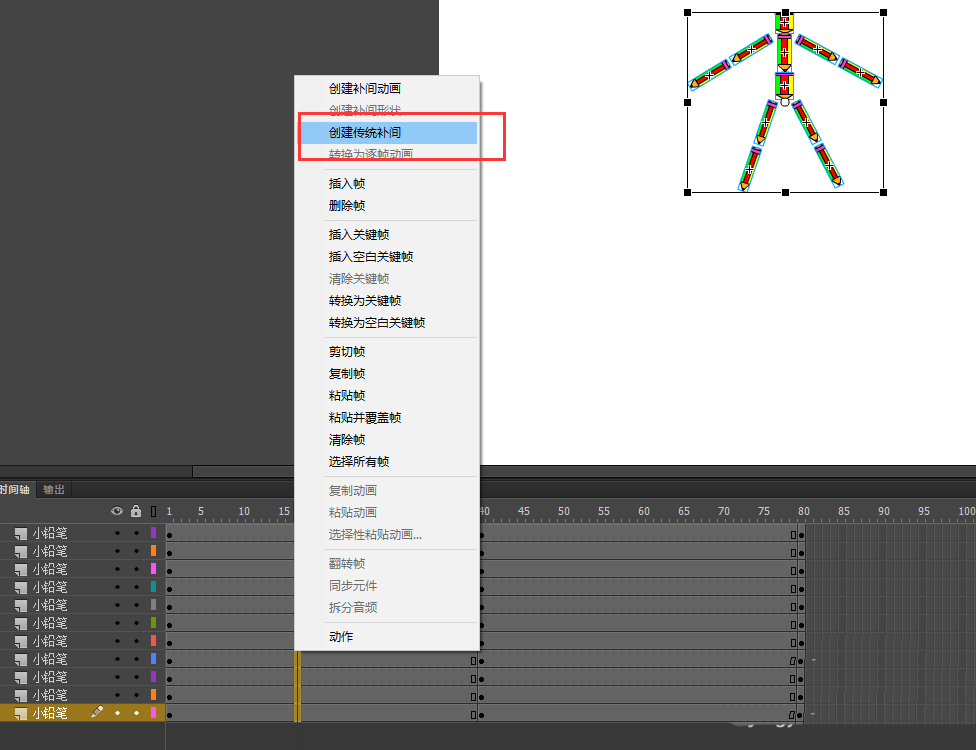 7、選中所有圖層第1幀右鍵選擇復制幀,然后在所有圖層的第80幀處選擇粘貼幀;然后在第1幀到40幀之間右鍵創建傳統補間動畫;在第40幀與第80幀之間也創建傳統補間動畫;回車測試動畫,一個鉛筆人分離又合成的動畫效果就實現了。