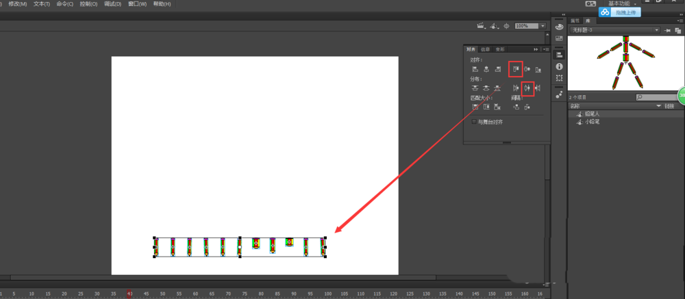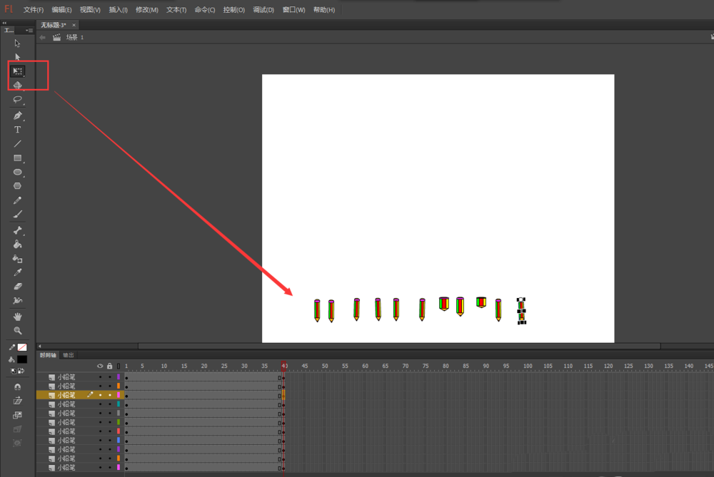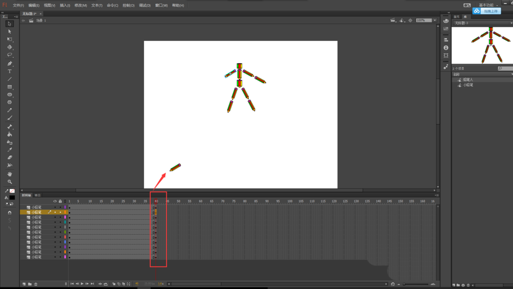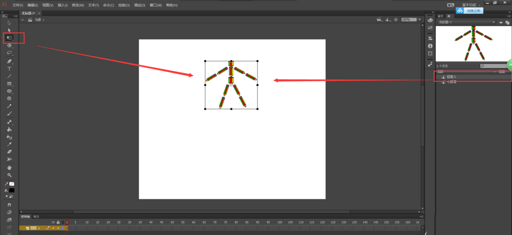 2、將我們之前的鉛筆人元件直接拖入到場景畫布中。然后選擇任意變形工具,將鉛筆人縮放到合適大小。