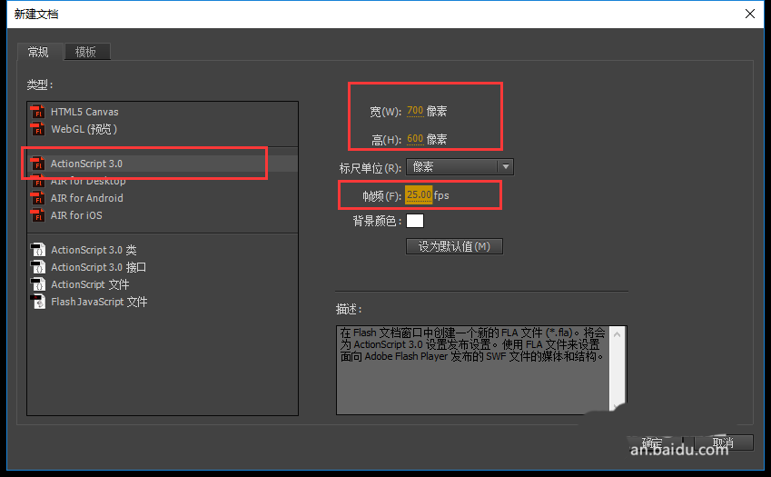 1、打開flash軟件,新建一個項目,項目的畫布大小設置為700*600像素,幀頻為25,點擊確定。