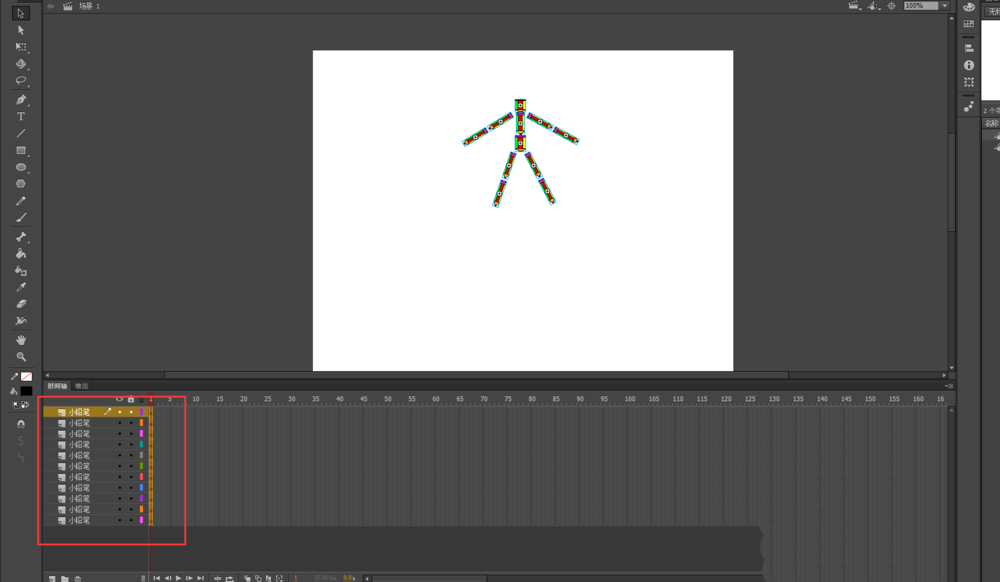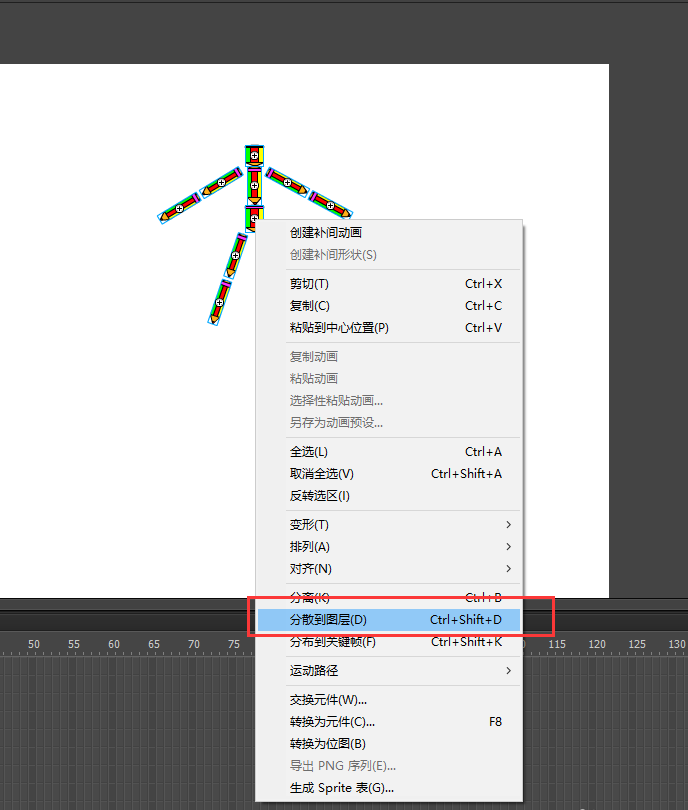 4、再次選中分離后的鉛筆人,右鍵鼠標選擇分散到圖層命令,然后會看到在時間軸窗口中就多了很多圖層,鉛筆人的每個組件小鉛筆都單獨構成一個圖層,現在原來的圖層1就沒有任何作用了,所以選中原來的圖層1直接刪除,只留下分散鉛筆人到圖層后的圖層。