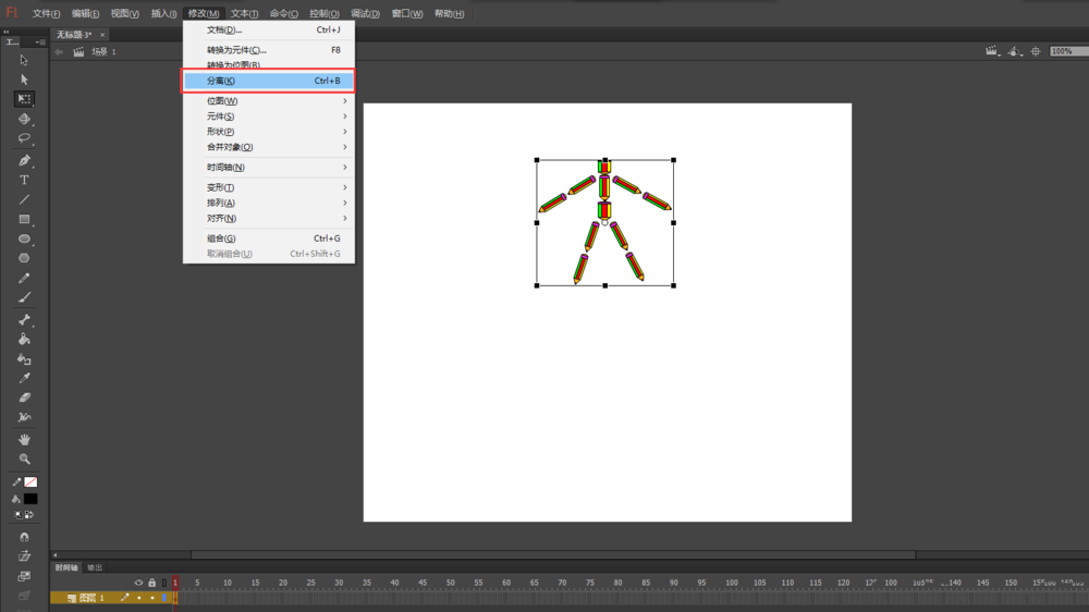 3、選中整個鉛筆人圖形元件,選擇修改菜單欄中的分離操作,將鉛筆人進行分離。