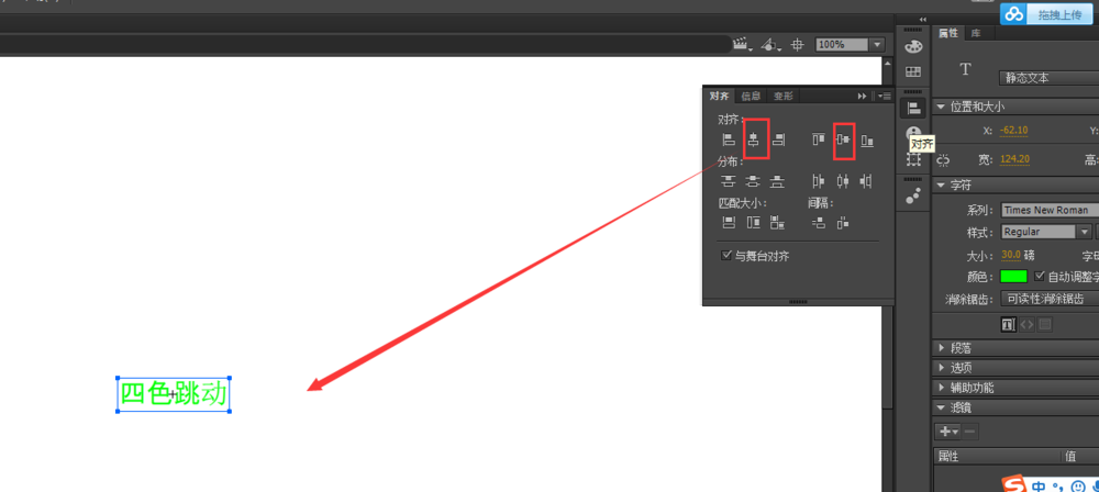 3、選擇工具欄中文字工具,在影片剪輯中輸入文字“四色跳動(dòng)”四個(gè)字,然后打開(kāi)對(duì)齊窗口,設(shè)置水平對(duì)齊與垂直對(duì)齊。