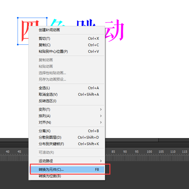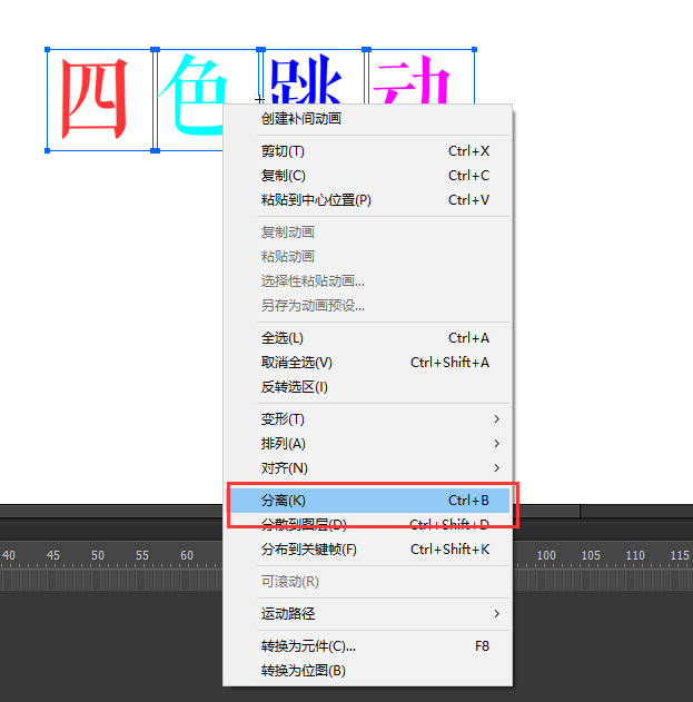 5、選中文本內(nèi)容,右鍵選擇分離,將其分離為四個(gè)單個(gè)文本;然后在依次選中四個(gè)單個(gè)文本,右鍵選擇轉(zhuǎn)換為元件,將四個(gè)單獨(dú)的文本都轉(zhuǎn)換為圖形元件。