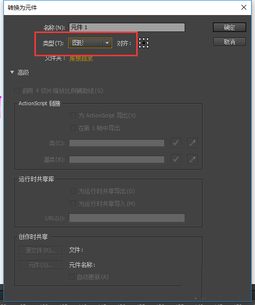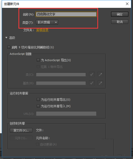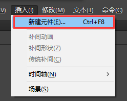 2、選擇菜單欄中插入菜單,選擇新建元件命名,彈出新建元件窗口,選擇新建一個(gè)影片剪輯元件,元件命名為“四色跳動(dòng)文字”,然后點(diǎn)擊確定進(jìn)行創(chuàng)建。