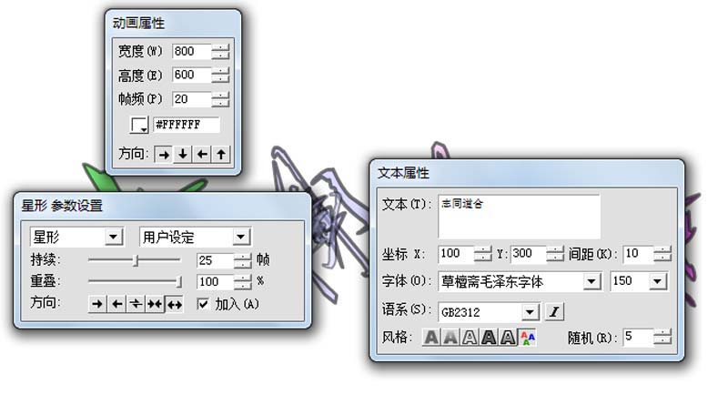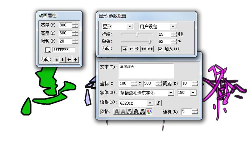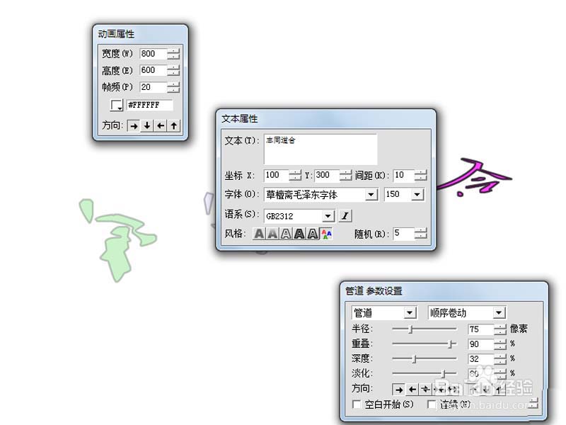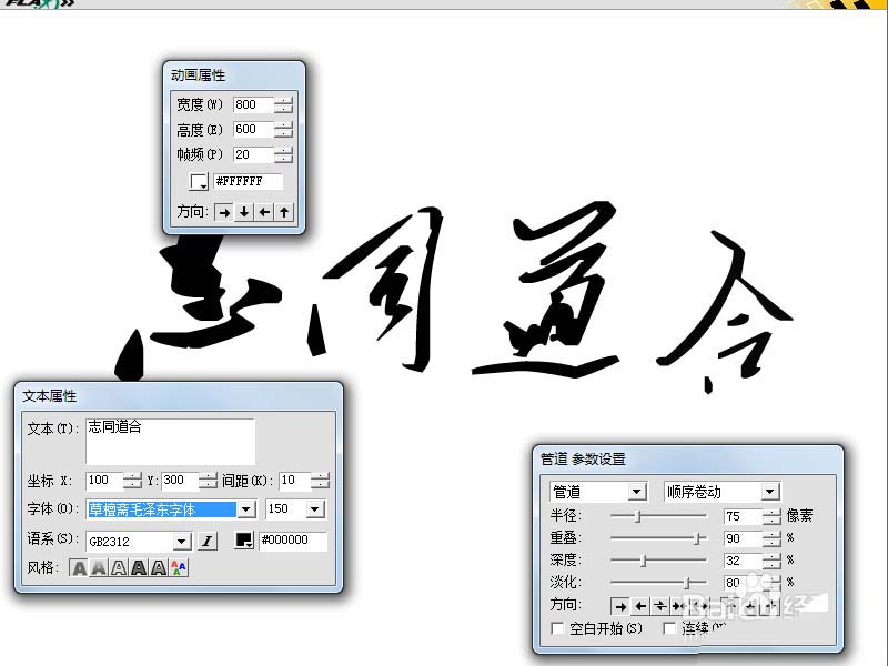 2、在文本屬性對話框中輸入文本為志同道合,設置字體為草檀齋毛澤東字體,字號為150.