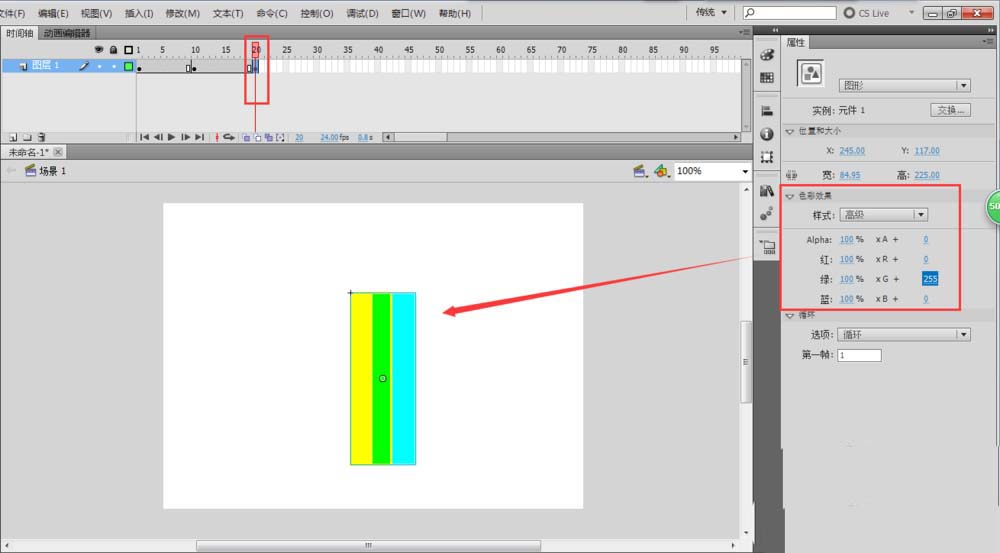 6、同樣的在時間軸窗口第二十幀的位置也按F6創建一個關鍵幀,選中第二十幀,單擊矩形,在屬性中設置色彩效果,將綠色的數值改為255.