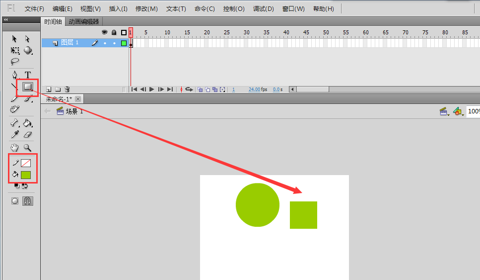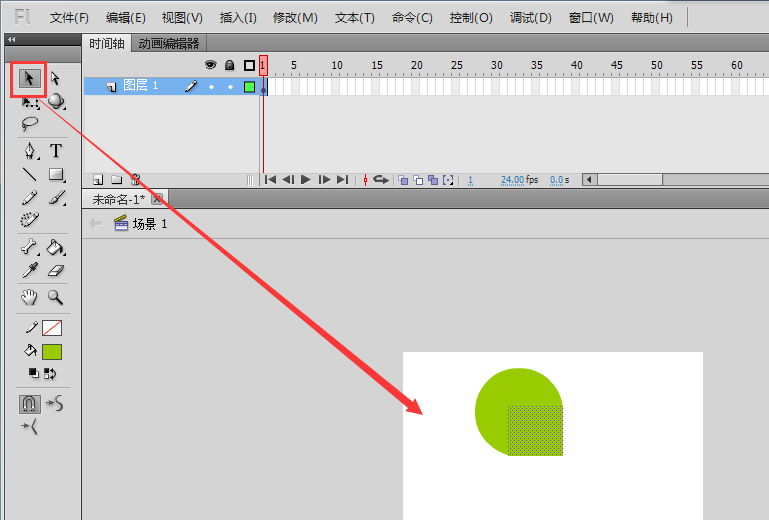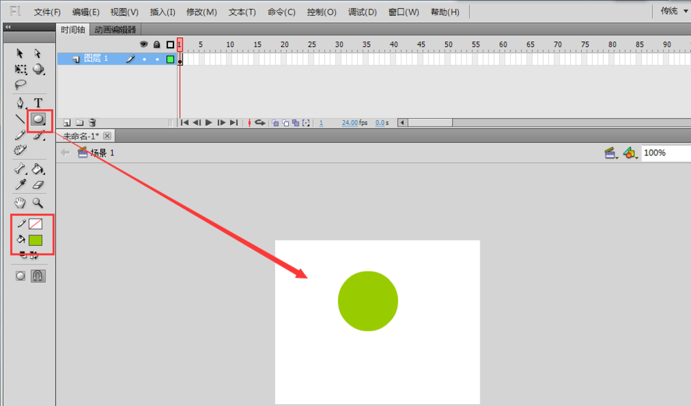 3、選擇工具欄中的橢圓工具,設(shè)置橢圓的筆觸顏色為無,填充顏色為草綠色,然后按住鍵盤上的shift鍵,來繪制出一個大小合適的正圓出來。