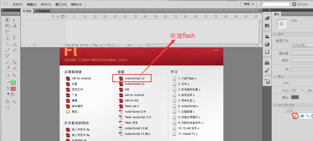 1、雙擊flash的快捷圖標(biāo),打開flash二維動畫設(shè)計軟件,選擇新建一個flash項目。