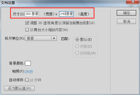 2、在flash場景中右鍵鼠標(biāo),選擇文檔屬性命令,在彈出的文檔設(shè)置窗口中,設(shè)置文檔的大小,將文檔寬度設(shè)置為300像素,高度為240像素,然后點擊確定。