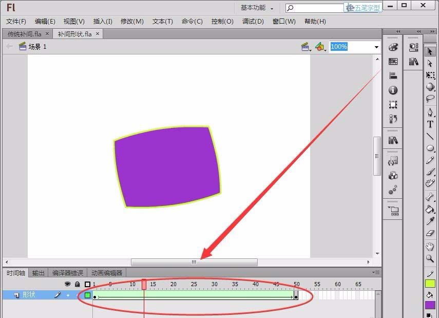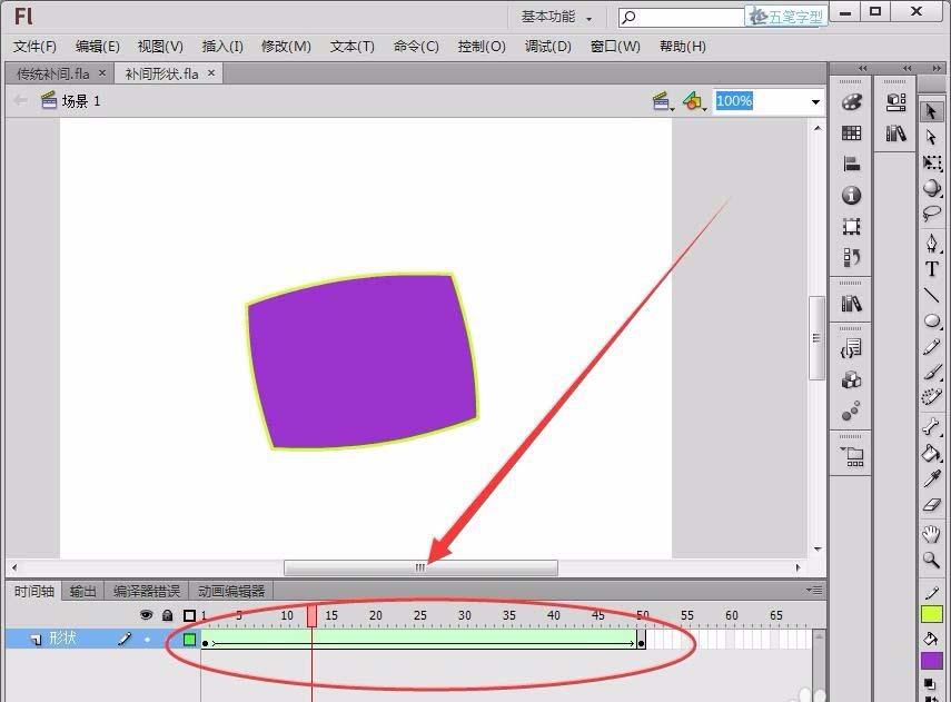 1、補間形狀動畫創建好后,它的時間軸的背景色是淡綠色的。