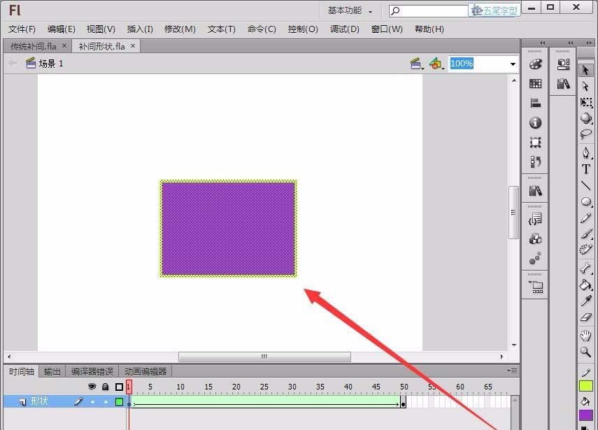 3、補間形狀動畫中的圖形,必須是矢量圖形,不能是元件。