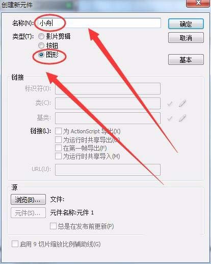3、創(chuàng)建新元件對(duì)話框中,給元件取名,本例為小舟,類型選擇為圖形。