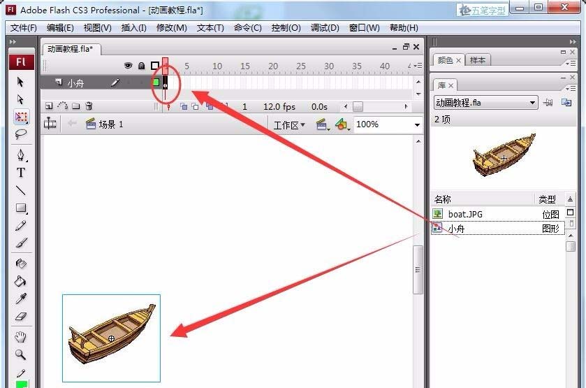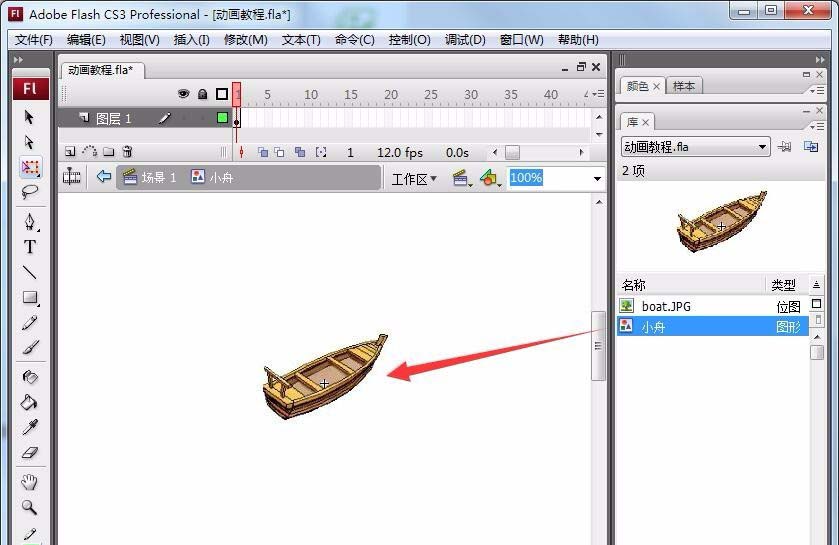 6、圖層的第1幀,將小舟圖形拖動(dòng)到舞臺(tái)的左下方。