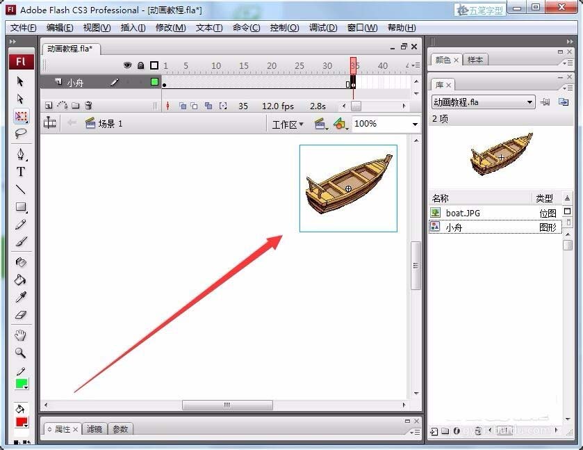 Flash CS3中的小船想要添加動(dòng)畫效果,比如從舞臺(tái)左下角慢慢移動(dòng)到舞臺(tái)右上角,該怎么制作呢?下面我們就來(lái)看看詳細(xì)的教程。