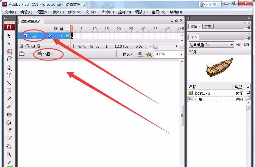 5、回到場(chǎng)景1,將圖層1命名為小舟。