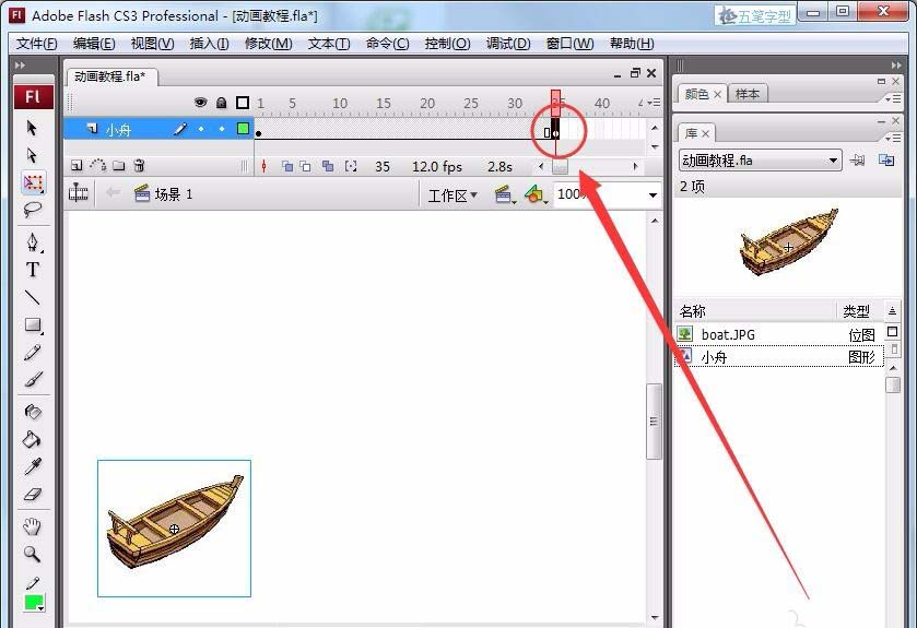 8、第35幀的舞臺(tái)上,將小舟圖形拖動(dòng)到右上方。