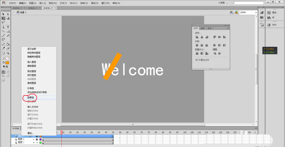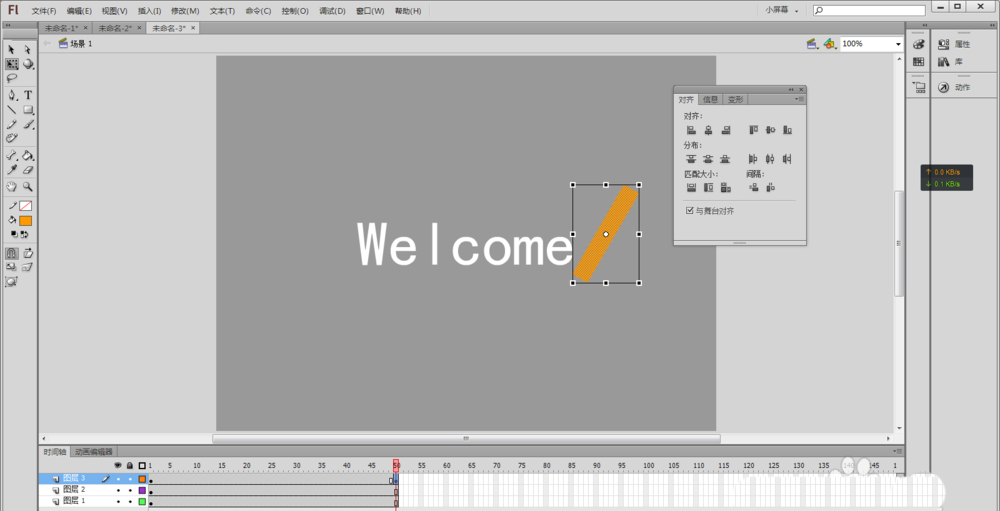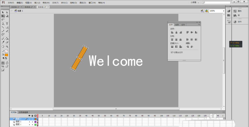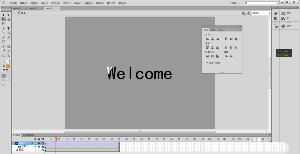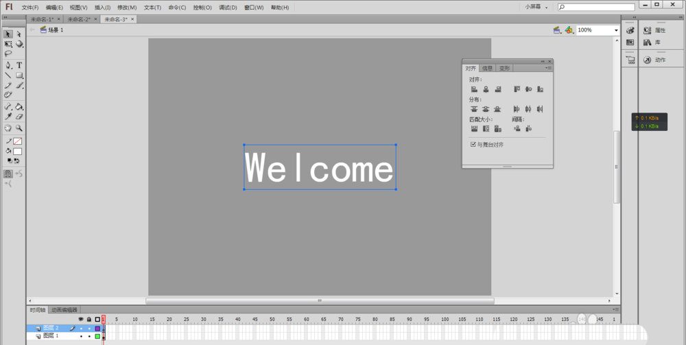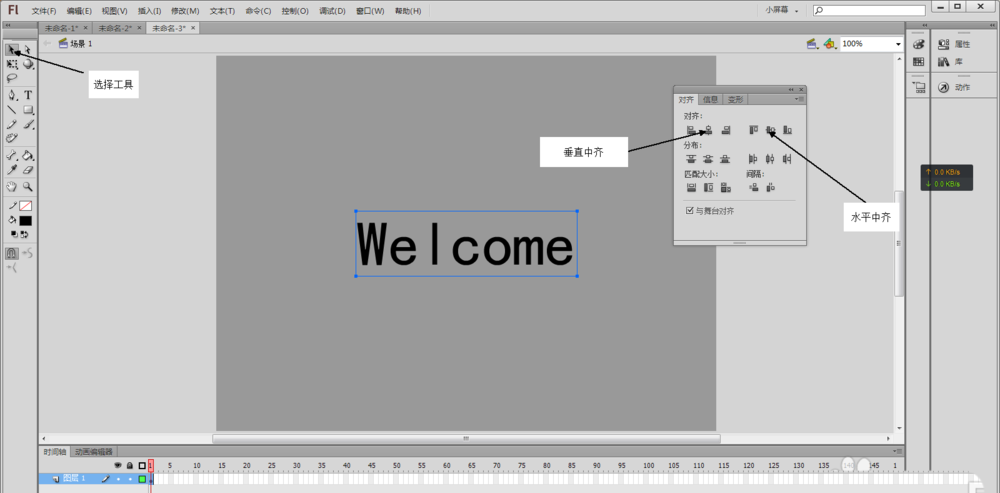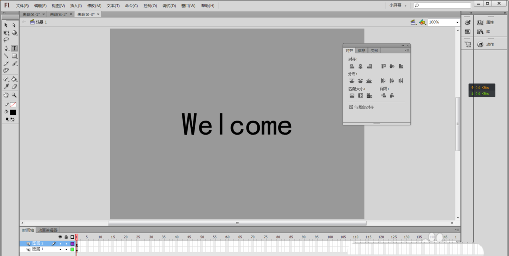 2、用鼠標選擇文本工具(或者按快捷鍵T),在舞臺中央輸入Welcome(或者自己想實現效果的文字),并在“屬性”中將文字顏色設置為黑色,使用鼠標選擇工具箱中的選擇工具(快捷鍵V)選擇舞臺上剛輸入的文字,然后按快捷鍵Ctrl+K,讓選中的文本“水平中齊”和“垂直中齊”