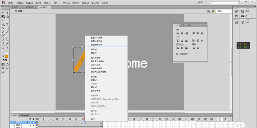 7、然后在矩形圖層中點擊兩個關鍵幀中的任意位置,單擊鼠標右鍵選擇添加“創建傳統補間 ”。