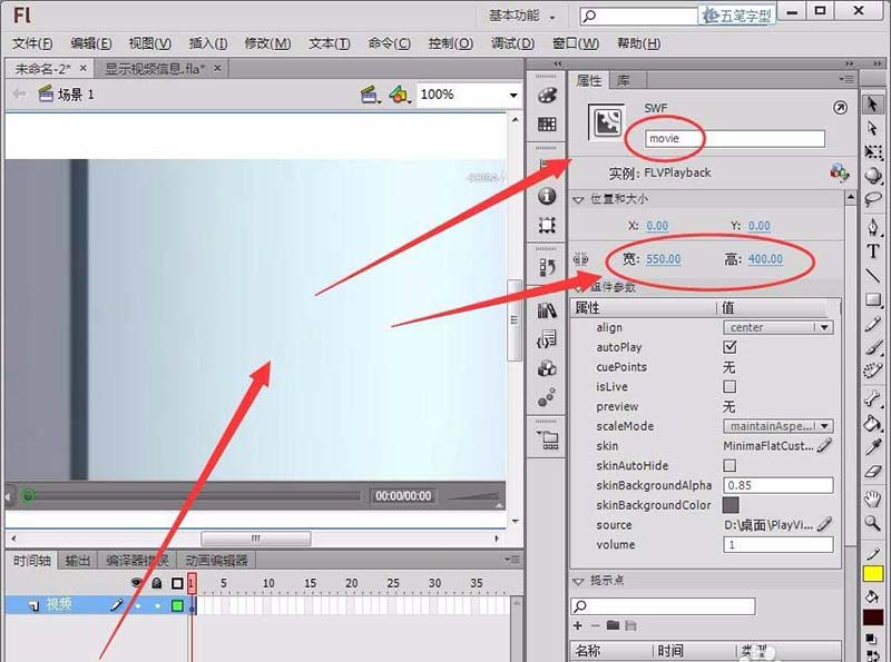 2、選中視頻,在屬性面板中更改視頻的大小,將實例名稱取名為“movie”。