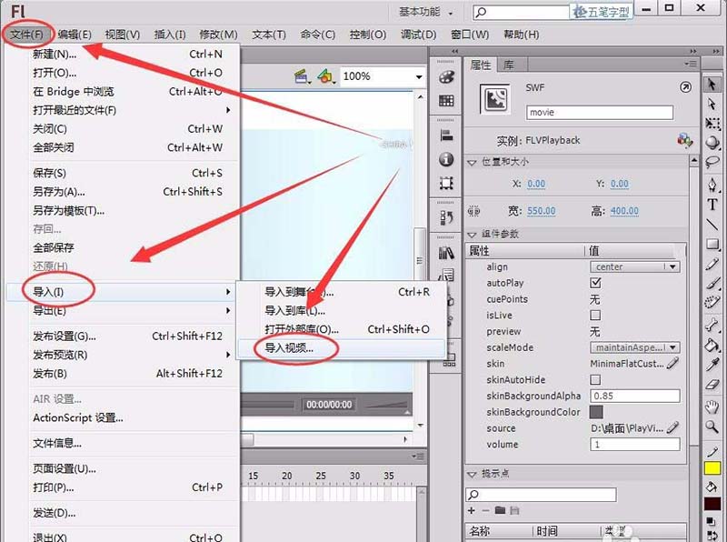 1、創(chuàng)建一個Flash文件,單擊“文件”---->“導入”---->“導入視頻”,在Flash中導入一個視頻文件。