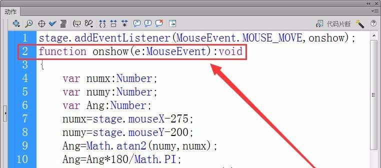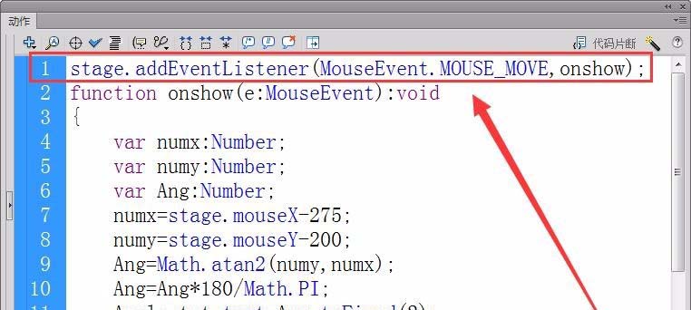 4、首先,注冊(cè)一個(gè)舞臺(tái)鼠標(biāo)移動(dòng)事件的偵聽器,接收者函數(shù)為onshow。